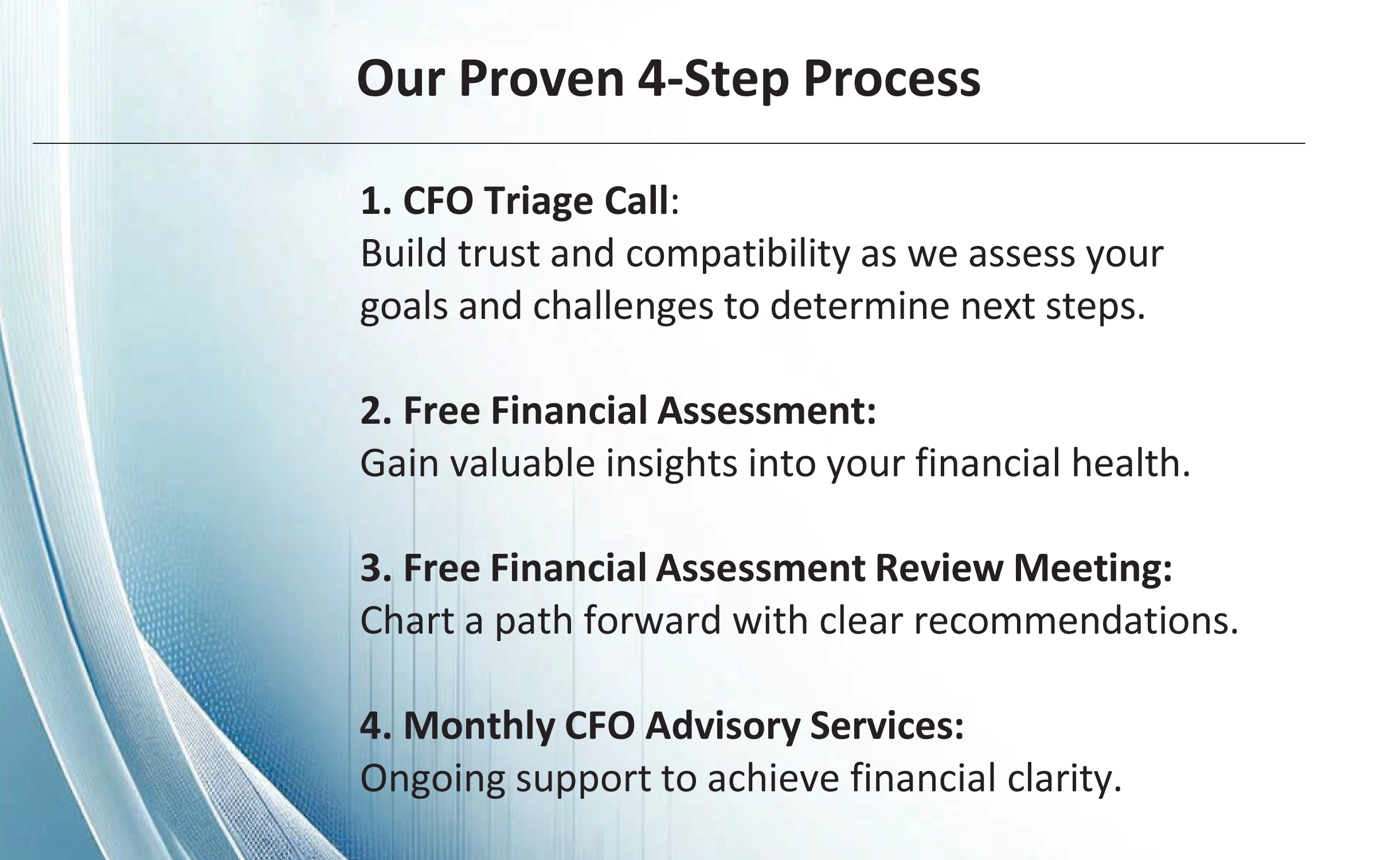 Offsite CFO Services is your partner in financial clarity and business growth. We act as your outsourced CFO—bringing a practical, hands-on approach that goes beyond bookkeeping. We help you build the financial systems, scoreboards/KPIs, and strategy needed to improve cash flow, increase profitability, and elevate business value. Our proven 4-step process starts with a CFO Triage Call, followed by a Free Financial Assessment and Review Meeting, then ongoing Monthly CFO Advisory Services.